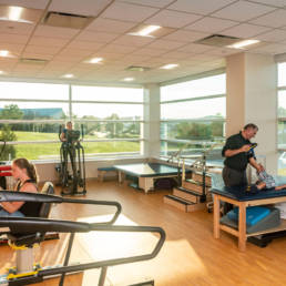 The ground level includes about 10,000 square feet for rehabilitative services. An indoor track surrounds a 3,000 square foot gym space for exercise, sensory integration, and gross motor skills. The track has access to an outdoor path for rehabilitation bikes and tricycles. An exterior patio with playground equipment provides an alternative area for rehabilitation. As a nod to the nearby Pro Football Hall of Fame, a replica football field made of artificial playground grass accommodates additional rehab activities.