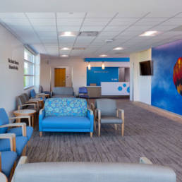 A central welcome center on level one allows patients and families to check in for appointments at self-serve kiosks or at the front desk. Open seating areas with large amounts of natural light and a mini ball machine provide comfortable places for patients and families to wait for appointments.